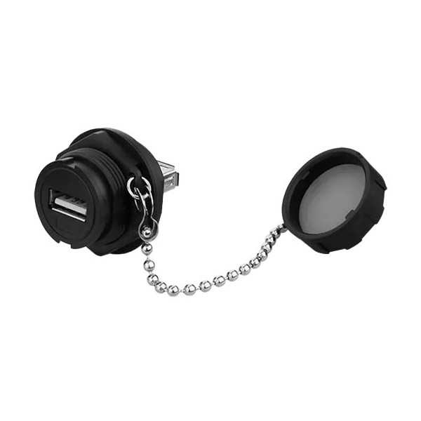 The USB2A-WTP-QR-CS-JCK USB 2.0 Type A Female Panel Mount Waterproof Connector and USB2A-WTP-QRFSM-1M Waterproof USB 2.0 Cable with IP67 Panel Mount Type A Female to Standard Type A Male Connectors are both compatible with the USB2A-WTP-QRMSM-1M Waterproof USB 2.0 Cable IP67 Type A Male to Standard Type A Male Connectors for a complete waterproof connection. The panel mount cable and connector include a tethered dust cap to prevent dust and moisture from entering the connector when not in use.